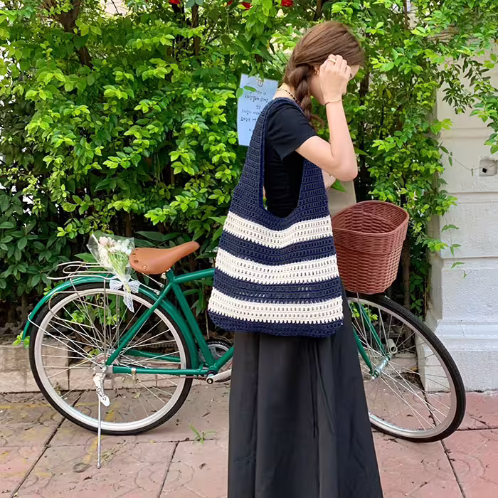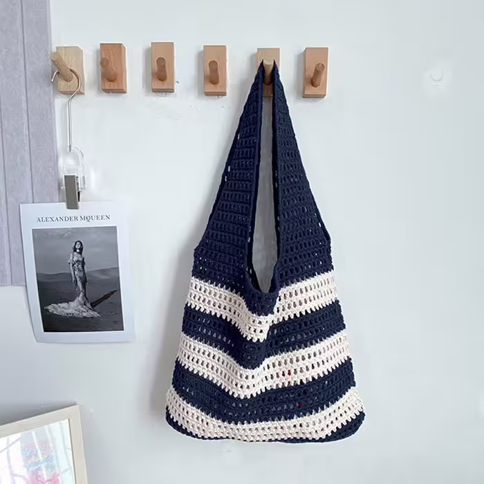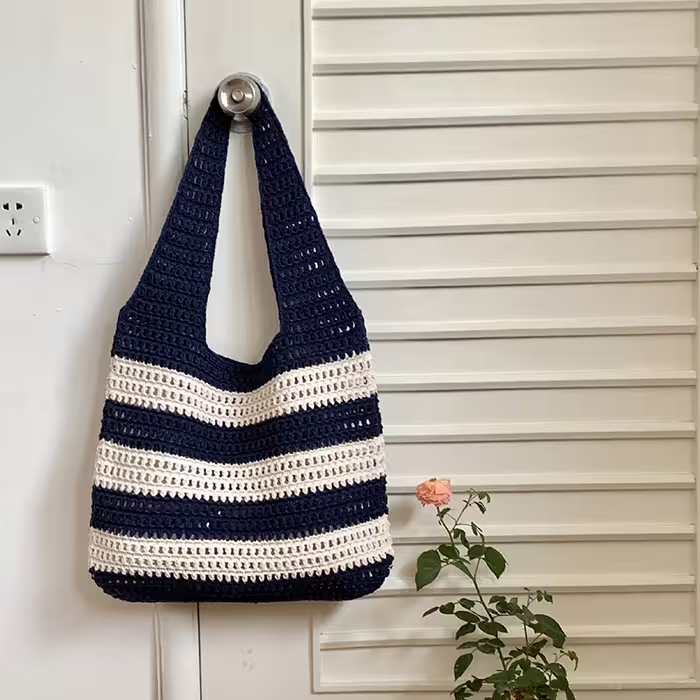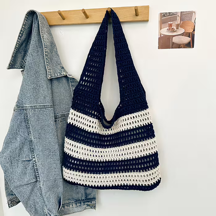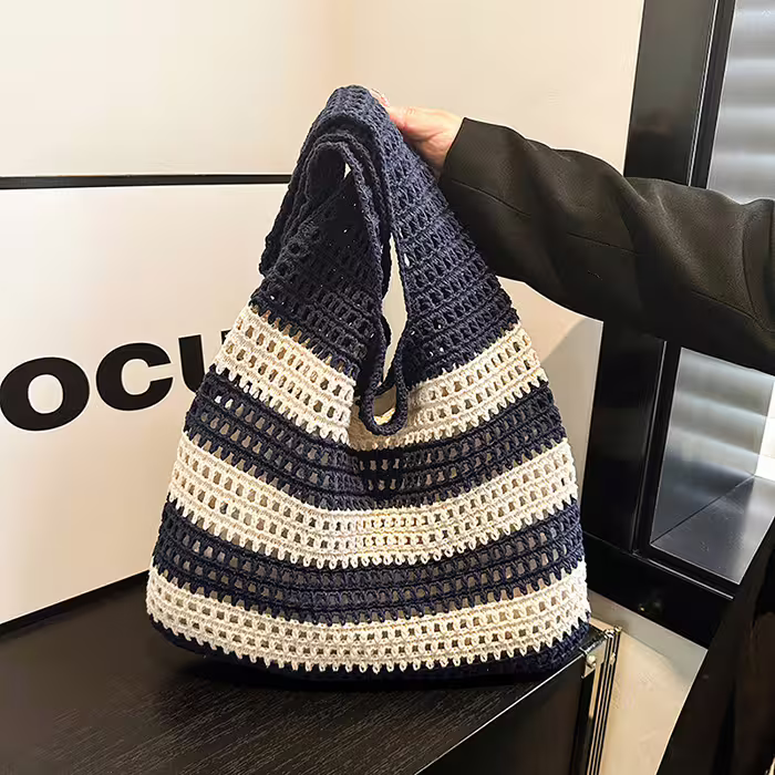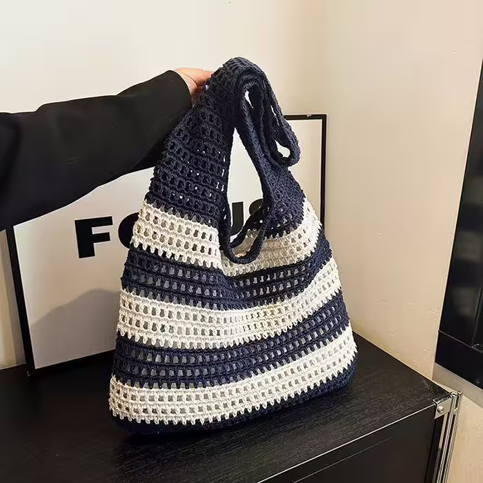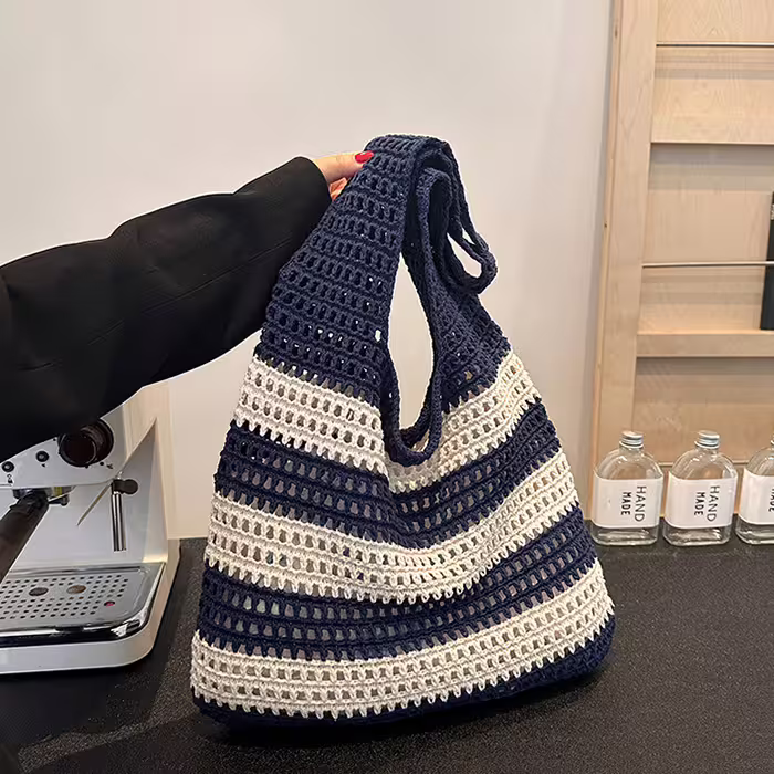 條紋拼接鏤空針織×肩背包×深藍-第1張