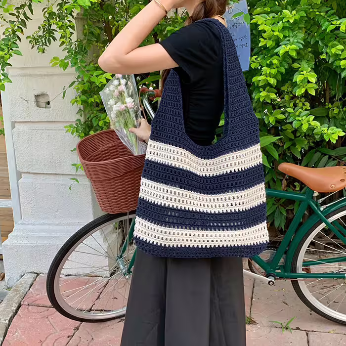 條紋拼接鏤空針織×肩背包×深藍-第5張