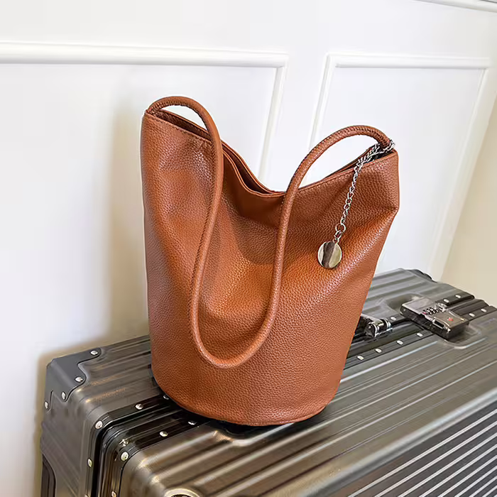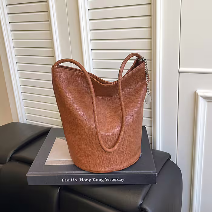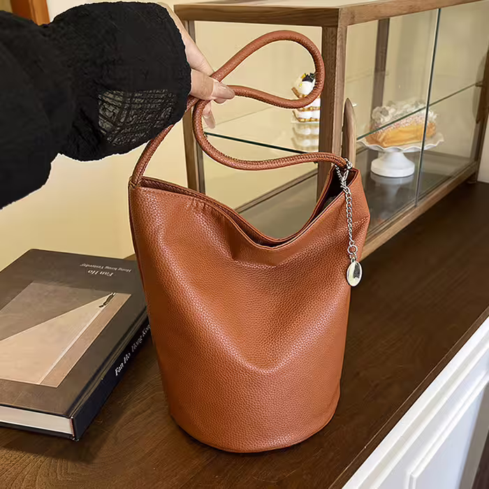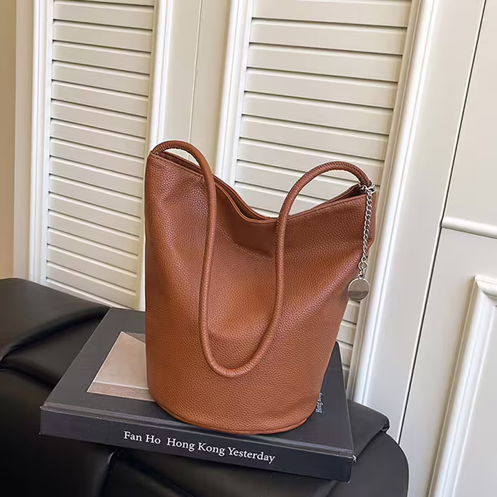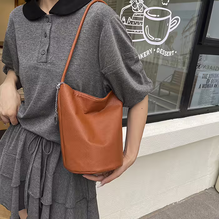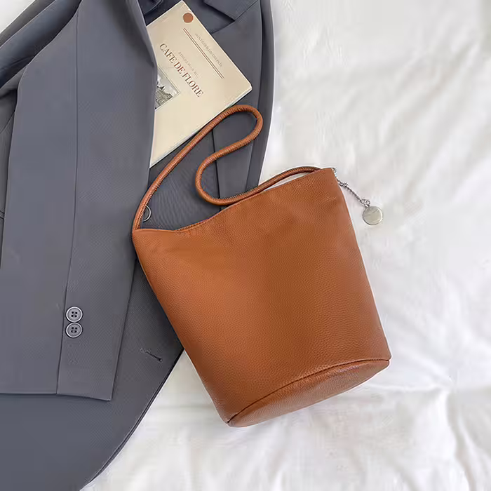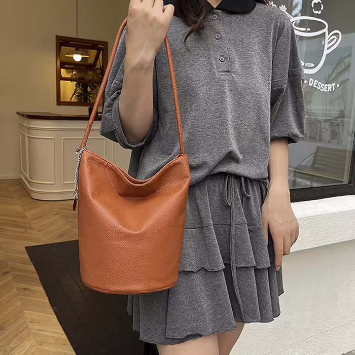 皮革圓身水桶包×肩背包×棕咖-第1張