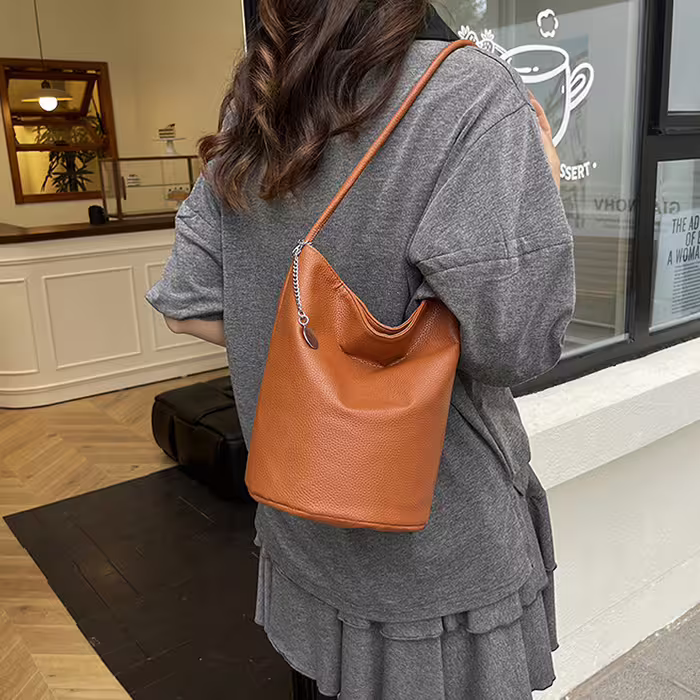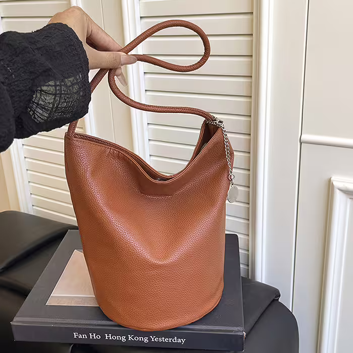 皮革圓身水桶包×肩背包×棕咖-第5張