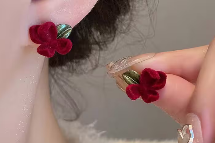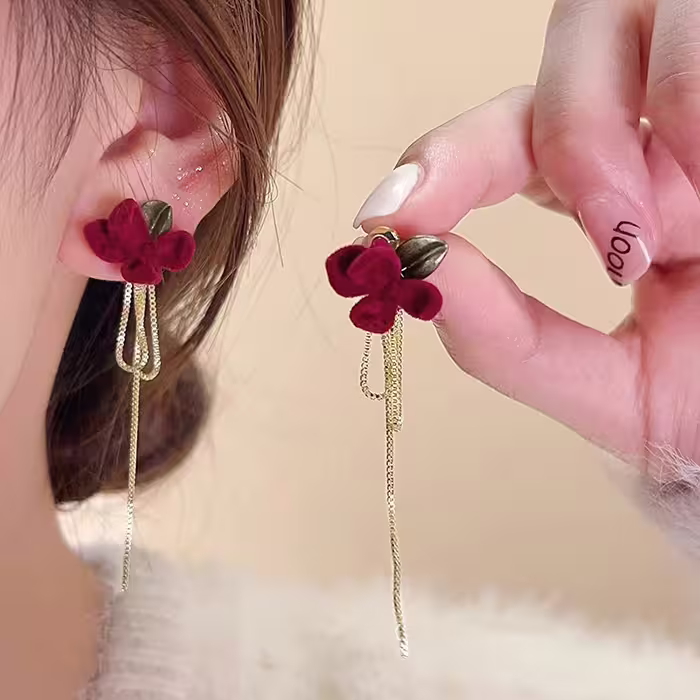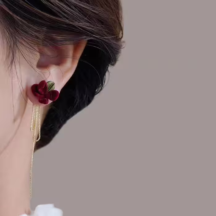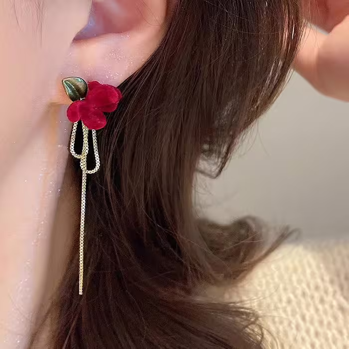▶名稱/紅絲絨梔子花鍊條×後掛式吊墜耳環